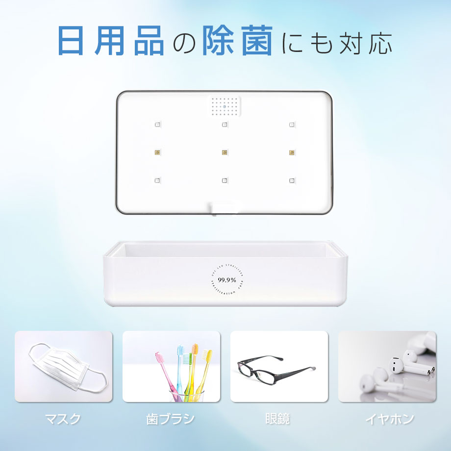 さらに5分間モードも搭載! 除菌対象はスマートフォン、イヤホン、鍵、使い捨てマスク、布マスク、歯ブラシ、メガネ、ジュエリーなど様々 【Qi急速ワイヤレス充電対応】 置くだけ簡単!急速ワイヤレス充電に対応(5W/7.5W/10W/15W) ※急速ワイヤレス充電をご使用いただく場合は、QuickCharge(QC)対応の電源アダプタ(9V/2A)をご使用いただく必要があります。