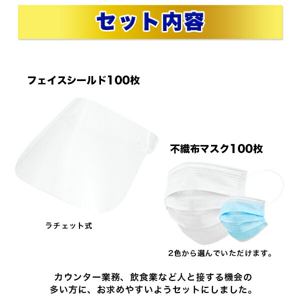 ■関連ワード フェイスシールド 不織布マスク 日本製 ゴムひも ゴム紐 即納 大人用 マスク フェイスガード フェイスマスク フェイスカバー 防護マスク マスク シールド 医療用 透明 水洗い 飛沫防止 感染防止 ウイルス対策 使い捨て 国内発送 不織布 セット まとめ売り 業務用 接客 接客業 飲食店 店員 業務用 送料無料さらに詳しいフェイスシールドの説明はコチラから さらに詳しいマスクの説明はコチラから 商品名フェイスシールド100枚と不織布マスク100枚のセット 内容物シールド(ラチェット式)100枚 / マスク100枚 素材シールド:PET マスク:不織布 / ゴム サイズ シールド:縦32cm × 横21.5cm × 厚み0.25mm マスク:17.5cm x 9.5cm マスクのカラー 《全2色》 1.ブルー 2.ホワイト ※フェイスシールドは共通(クリア)です。